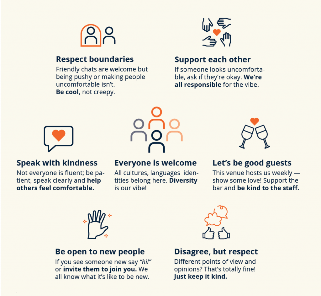 - Be Kind: Treat everyone with kindness and respect. Any form of disrespectful or offensive behavior, including unwanted advances or comments, will not be tolerated.